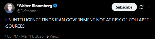 >>530500691>US Intelligence saying there is no "winning" in IranTrump was told by his intelligence agencies and military planners prior to the war that he couldn't win it