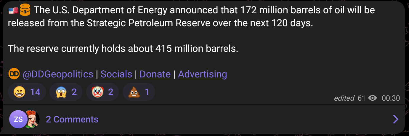 >President Trump approved the release of 172 million barrels of oil from the strategic oil reserve, the release will start next week and last about 120 days.