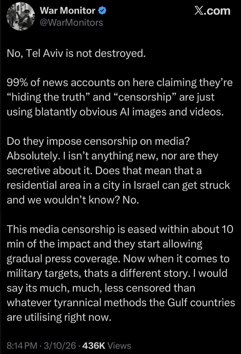 prev: >>530498051Timeline▶Day: 12>▶Day: 11>Trump says the U.S. will release a little oil from its strategic reserves.>Iran mined the strait per Reuters>CENTCOM warned in persian language they’re going to blow up civvy port infrastructure>Axios: Trump’s peace propos was refused>IEA released 400 million oil barrels on the market>Crude oil at 91$>Drone strike halts production at Ruwais oil refinery - largest in the UAE>Tehran witnesses heaviest bombing since the start of the war>Several oil companies cry force majeure>There seems to be no planes going from and to Israel>Strikes in Israel going on▶Livestreamshttps://www.youtube.com/watch?v=4E-iFtUM2kkhttps://www.youtube.com/watch?v=JHwwZRH2wz8▶Telegram channels:https://rentry.org/tgnews▶Twitter accounts https://nitter.net/clashreporthttps://nitter.net/FaytuksNetworkhttps://nitter.net/sentdefender▶Israel Rocket Alertshttps://www.tzevaadom.co.il/en/▶Air Traffichttps://www.flightradar24.com/https://flightaware.com/livehttps://globe.adsbexchange.com▶Maritime Traffichttps://www.marinetraffic.com/https://www.vesselfinder.com/Note: something something neutrality. just don't be a nigger and shit up the OP