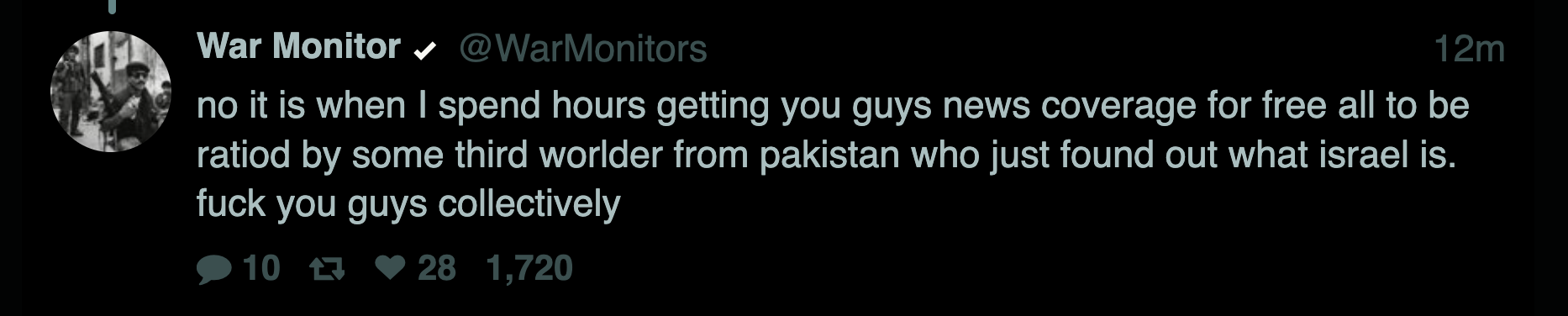 >>530504495I'm not sure switch tactics from denial of anything happening to look at how we are being btfo will work too well considering how much the world delights in seeing the Synagogue of Satan and it's pretender jews blown to pieces.There is no sympathy to be gained.