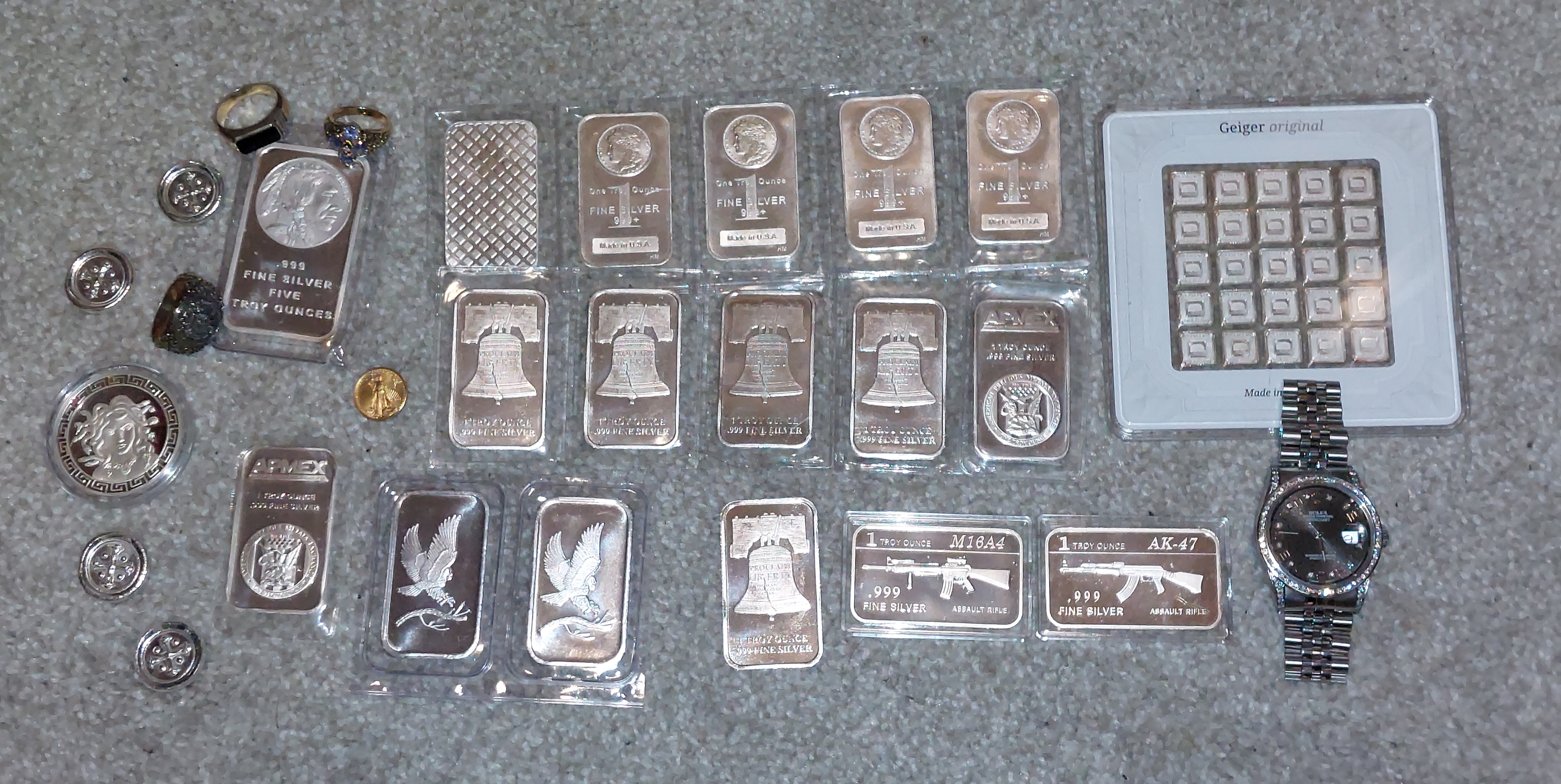 yes, i really like your bars from the different mints. mine are all apmex. what is the package above your watch, and would you like to tell us about some of your items like the rings?