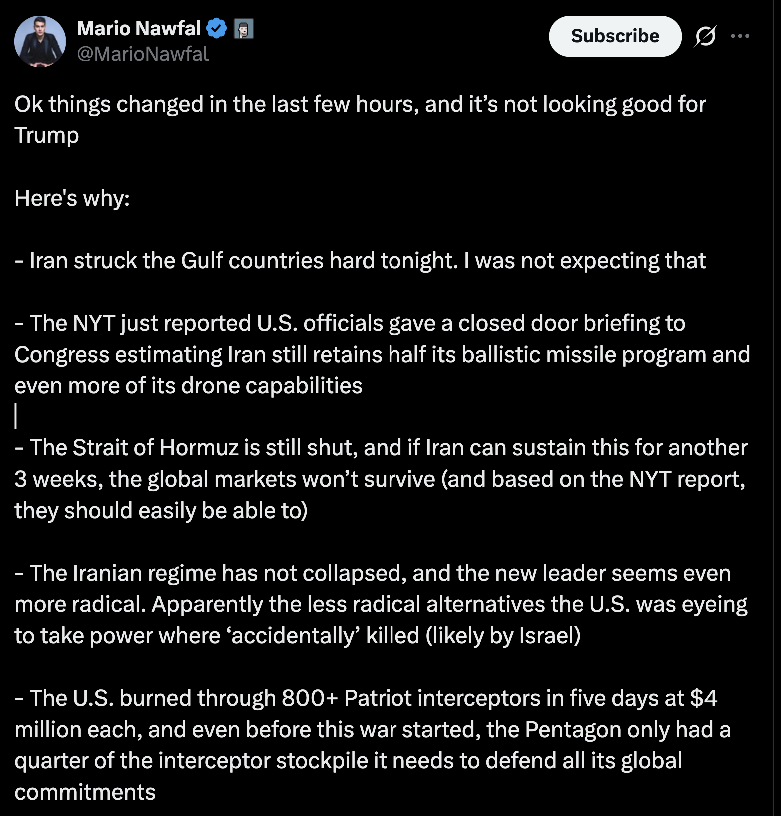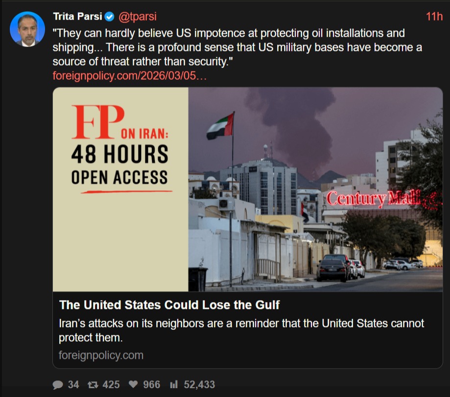 "They can hardly believe US impotence at protecting oil installations and shipping... There is a profound sense that US military bases have become a source of threat rather than security."https://foreignpolicy.com/2026/03/05/iran-israel-united-states-war-gulf-countries-alliances/
