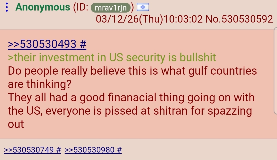 >>530530530>America and Israel claim they're DESTROYING Iran>Post shitty videos of them blowing up drones with 50 million dollar missiles >mutts repost and cheer>Iran claim they're DESTROYING America/Israel>They post endless AI slop>third worlders and commies cheerso what the fuck is actually happening with this war?