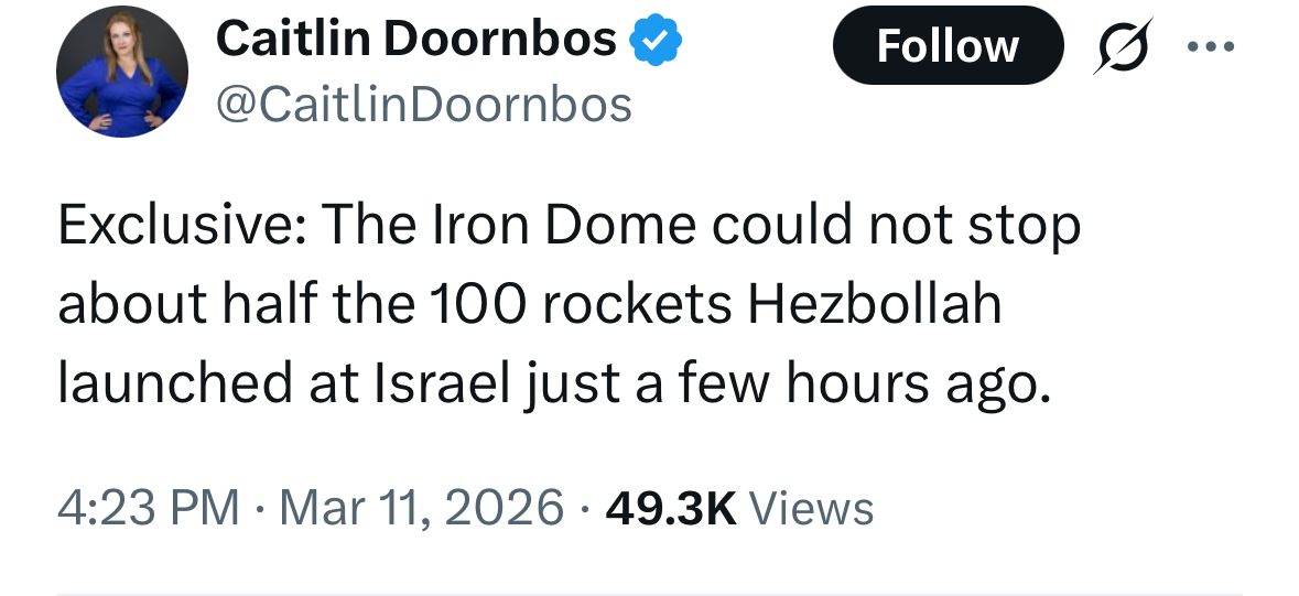 >First week of fighting costed more than 11 bilions>American tanker down>Israeli-American Rabbi Yehuda Kaploun, Trump's Chabadnik pick for US Antisemitism Czar: "Pres. Trump and Sec. Rubio's message, and their marching orders, are clear, and they're crystal clear—the scourge of anti-Semitism must be defeated anywhere and everywhere that it exists.>The Republican Jewish Coalition's Norm Coleman says conservatives have an "obligation" to "confront anti-Semitic bad actors" like Tucker Carlson, Candace Owens, Nick Fuentes, and James Fishback.>Multiple hits on Tel Aviv last night