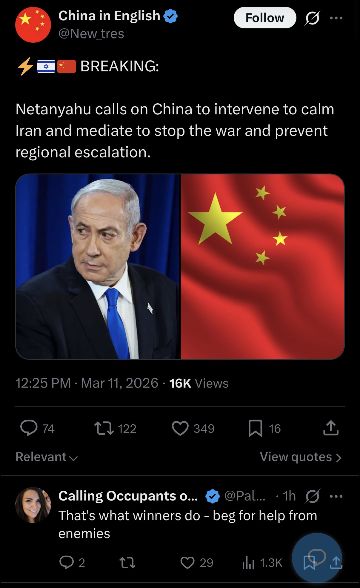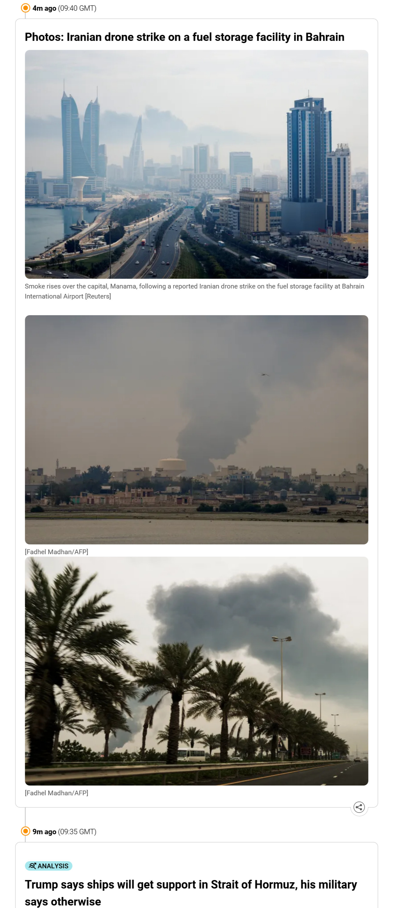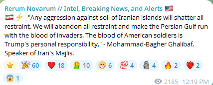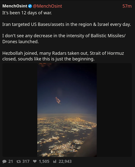 prev: >>530525088Timeline▶Day: 12>US to release 172 million barrels of oil>Brent 97 dollar>WTI 92 dollar▶Day: 11>Trump says the U.S. will release a little oil from its strategic reserves.>Iran mined the strait per Reuters>CENTCOM warned in persian language they’re going to blow up civvy port infrastructure>Axios: Trump’s peace propos was refused>IEA released 400 million oil barrels on the market>Crude oil at 91$>Drone strike halts production at Ruwais oil refinery - largest in the UAE>Tehran witnesses heaviest bombing since the start of the war>Several oil companies cry force majeure>There seems to be no planes going from and to Israel>Strikes in Israel going on▶Livestreamshttps://www.youtube.com/watch?v=4E-iFtUM2kk [Open] [Open]https://www.youtube.com/watch?v=JHwwZRH2wz8 [Open] [Open]▶Telegram channels:https://rentry.org/tgnews▶Twitter accountshttps://nitter.net/clashreporthttps://nitter.net/FaytuksNetworkhttps://nitter.net/sentdefender▶Israel Rocket Alertshttps://www.tzevaadom.co.il/en/▶Air Traffichttps://www.flightradar24.com/https://flightaware.com/livehttps://globe.adsbexchange.com▶Maritime Traffichttps://www.marinetraffic.com/https://www.vesselfinder.com/Note: something something neutrality. just don't be a nagger and shit up the OP or split threads.