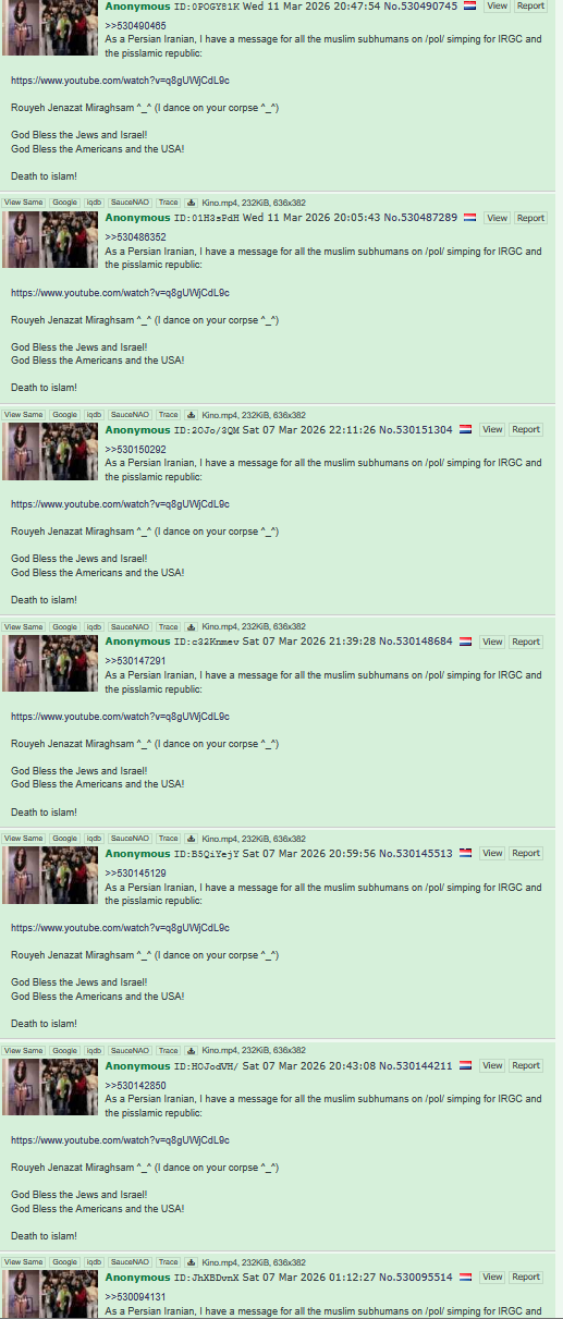 >>530530530The final battle between True Iranians and muslim "Iranian" subhumans is almost here, one of us has to be genocided, no other option. These are my last days posting with you guys on /pol/, as a Persian Iranian I will be going back to Iran for this final battle, I might die in Iran, consider this a pre-emptive goodbye.https://www.youtube.com/watch?v=UGtSr-qN9zUTo the Iranians: OUR KING IS A BLACKSMITH,OUR KING IS A BLACKSMITH,JAVID SHAH, JAVID SHAH!To the muslims:DEATH TO YOUR FOUNDATION!To the Americans:I will always love you for being the defenders of freedom and bringing freedom to my nation. From the bottom of my heart, thank you. God bless the USA!To the Jews:I am so happy Cyrus the Great freed the Jews from Babylon, now the Jews are freeing us Persians from the satanic pisslamic republic. God bless Mossad! AM YISRAEL CHAI!
