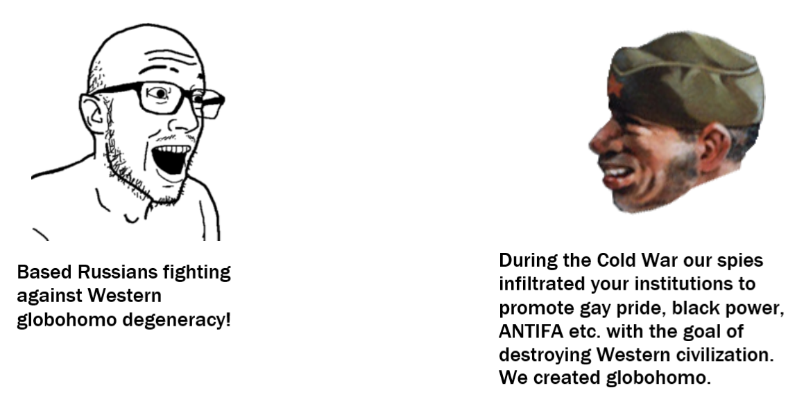 >>530537459>during the cold war our spies infiltrated your institutions and made them gaySo what this meme is telling me is Russians created ukraine supporters?that makes no sense.