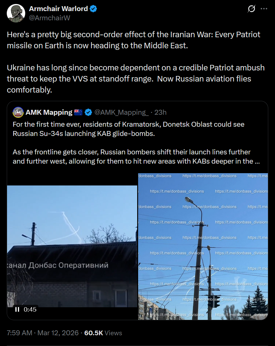 >>530534480turns out that rerouting Patriots to the ME is allowing Su-34s to fly farther and farther towards UAF held skies.