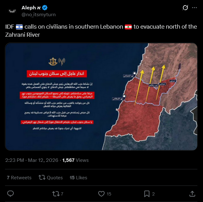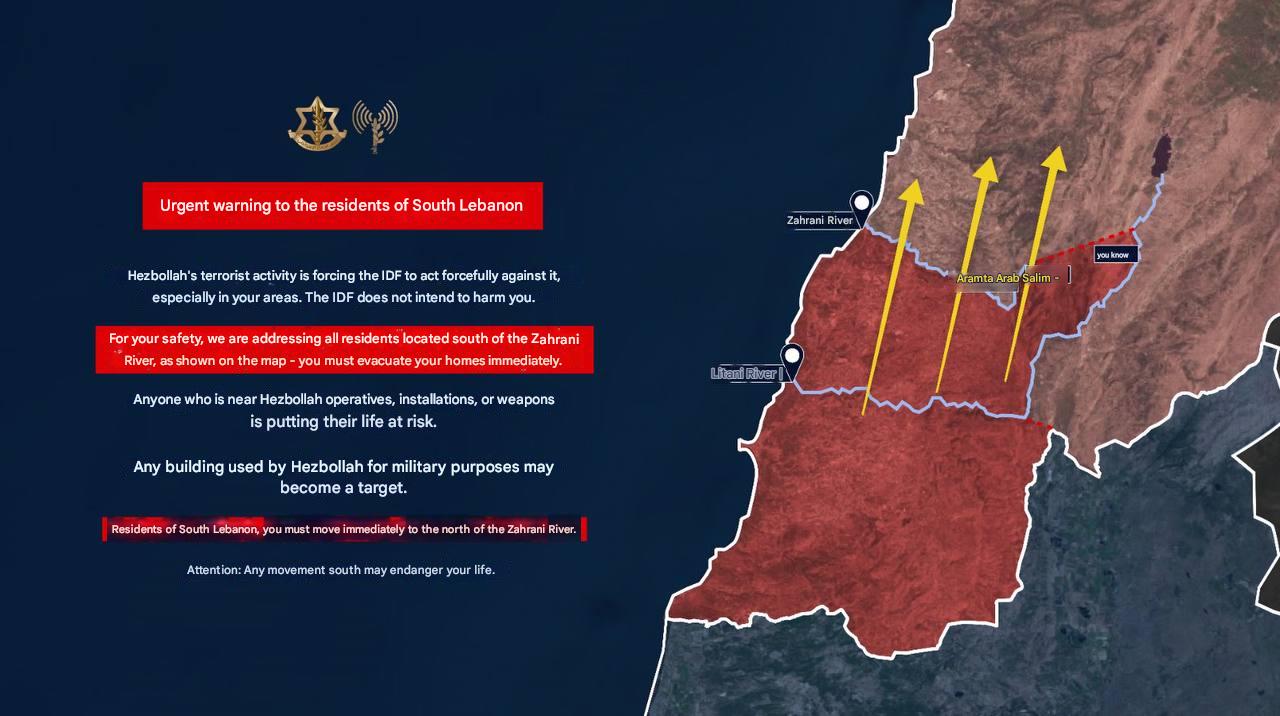 >The IDF spokesperson in Arabic expands on the evacuation of southern Lebanon and now instructs all residents of southern Lebanon to evacuate beyond the Zahrani River, not just those living south of the Litani River