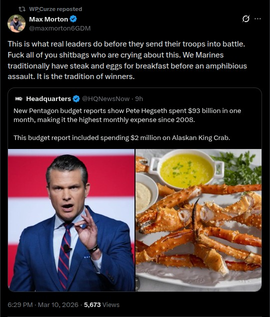 >>530543270>Muh steak and eggs!What does that have to do with Hegseth chowing down on fucking king crab?He's rich as fuck. He can use his own fucking money for that.How cucked are you people?