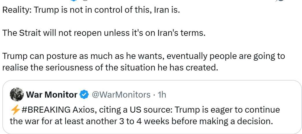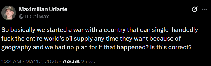 >>530547763Unironically, all they have to do is just get mines out into Hormuz.Trump can say, "Oh, our navy will just escort everybody!", but we've gotten rid of our minesweepers and the navy itself is telling shippers its too dangerous for them.Even once things are politically settled, that's weeks to clear mines and weeks-to-months to restart gulf oil production that had to be shut down.Protip: There's a good goddamn reason, in spite of decades of Israeli influence, why NO PRESIDENT had been stupid or compromised enough to try this shit until Trump.