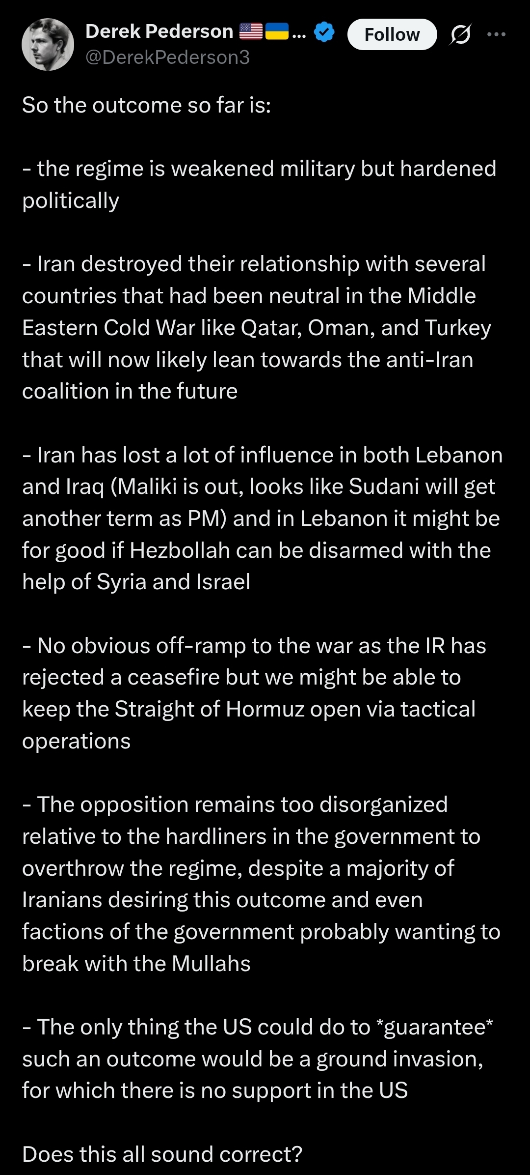 >>530544670Doesn't matter. There's no way Trump is going to be able to land invade nor occupy Iran. A regime change isn't going to happen overnight and even if there is 10-20% of the country still on the Ayatollah's side, that's an insurgency worthy of the Vietnam War. Trump just dragged the US into another Iraq, but it will be much worse.