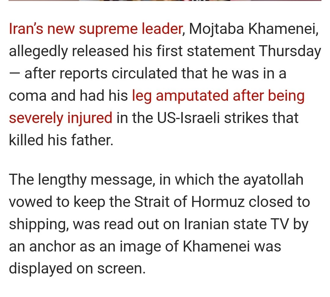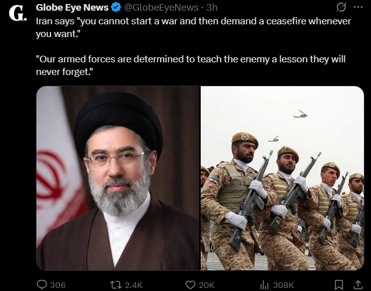 >“We will ask for compensation from the enemy. If we can’t get compensation from the enemy, we will destroy their properties as much as they have destroyed ours,” Iran’s new supreme leader said in an address, read by an anchor on state television.Pay up drumpftards (after you pay Canada reparations for your illegal tariffs though)