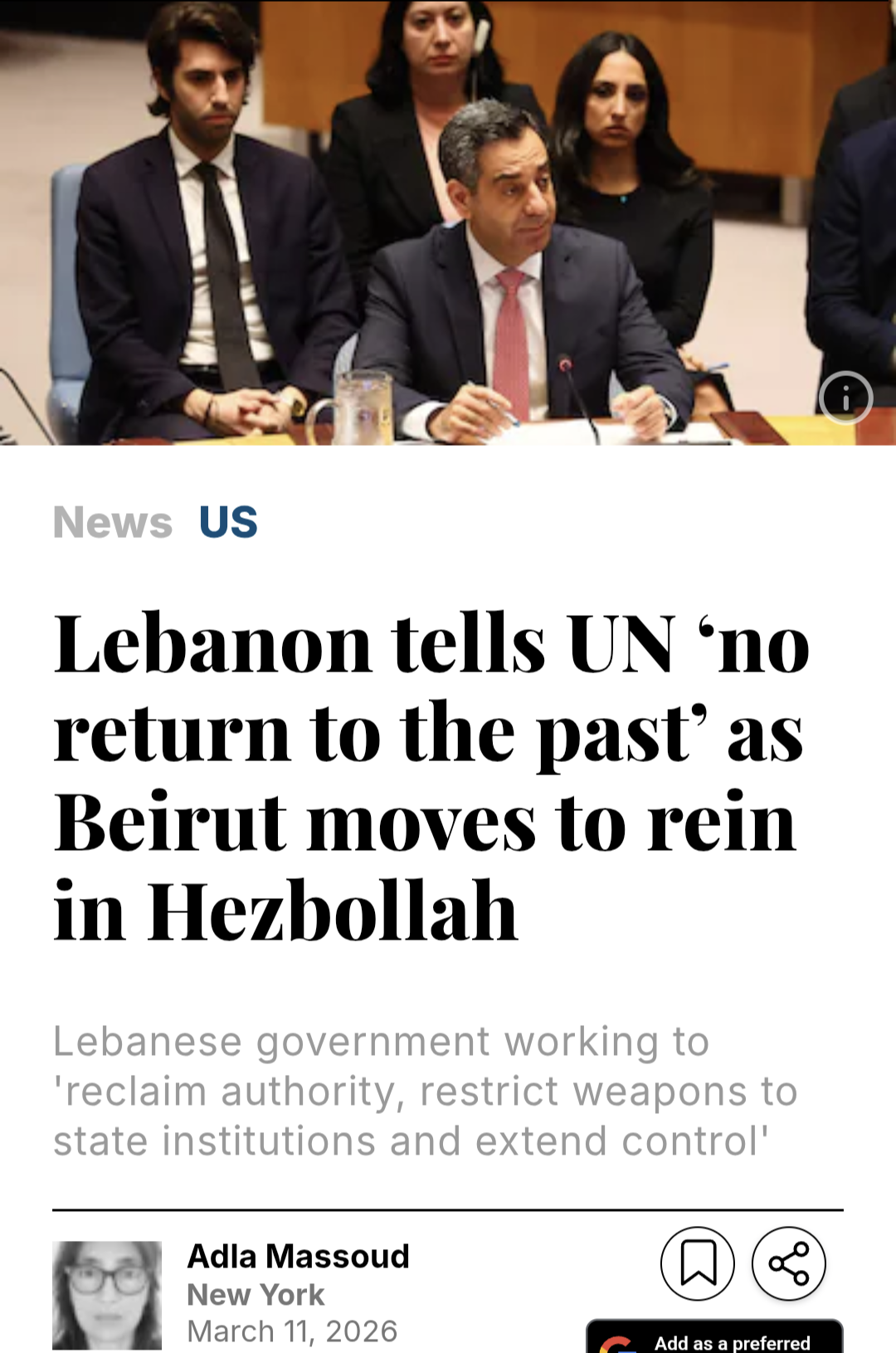 https://www.thenationalnews.com/news/us/2026/03/11/lebanon-tells-un-no-return-to-the-past-as-beirut-moves-to-rein-in-hezbollah/>The Lebanese government has sought to curb the group’s armed wing and end its status as a parallel military force operating outside state authority.>That shift became more evident on March 2, when Lebanon’s Cabinet moved to declare Hezbollah’s military activities illegal.>All but two of 24 government ministers backed the decision, with Hezbollah representatives voting against it. Ministers aligned with the Amal Movement led by parliamentary Speaker Nabih Berri, and seen widely as Hezbollah’s closest domestic ally, also supported the measure.>Mr Arafa said that as Lebanon’s priority was ending the war and protecting civilians, Beirut was ready to enter negotiations with Israel under international auspices to resolve outstanding disputes.>US ambassador Mike Waltz welcomed the March 2 decision by Lebanon to prohibit the military and security activities of Hezbollah, calling it a “historic milestone” towards “ending Hezbollah’s long and destructive influence in Lebanon”.>“Now is the time for the government of Lebanon to take back control of the entirety of its country,” he said. “We urge our friends in Lebanon to not let this moment slip away. Our message is clear: take your country back.”