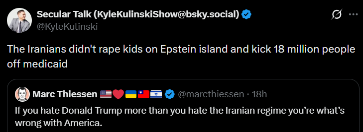 https://x.com/krassenstein/status/2032105416159527390?s=20>Krassenkike unironically posting Iran propaganda because Orange Man bad