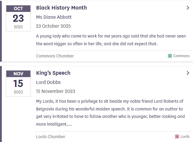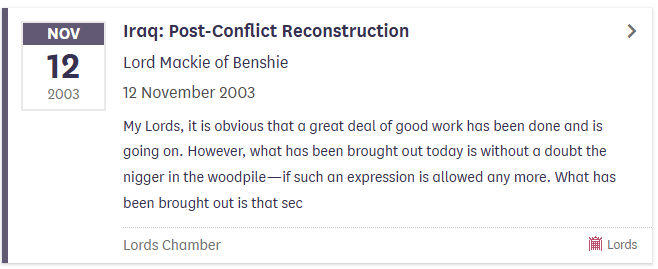 >>530569099It's only been used twice in the last five years in Parliamenthttps://hansard.parliament.uk/search?searchTerm=nigger&partial=False&sortOrder=1#StartDate