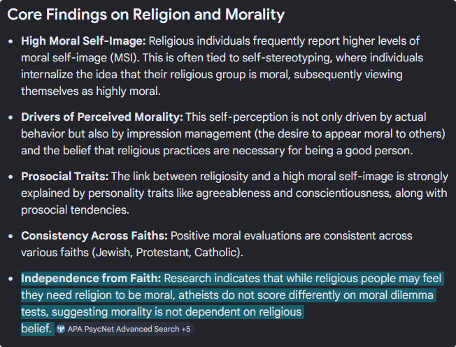>>530581380>>530581206Also fun fact: In double blind testing, christians think of themselves as more moral than atheists, but it doesn't actually lead to more moral behavior! It's purely a narrative trap that didn't change who they were in a positive manner that lined up with their self-image. It's impression management.