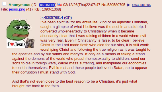 >>530580412>>530580561so you know all these weird little bits that you pick apart, i've never heard a christian talk about them.they are talking about things of much greater importance, morals, ethics, ways of life, ideas that help people. you guys seem to focus on a few tiny minutia and miss the vast wealth of knowledge, morals and mentally beneficial practices promoted by the majority of Christianity.like i don't care to debate this shit with you, your society is ugly and falling apart and being invaded. and you're arguing about things that don't matter. i am keeping ancient truth alive, i am keeping the morals and institutions going that built the good society that is being destroyed today.>>530580795>converted wholeheartedly to Christianity when it became abundantly clear that I was raising children in a world where evil was very real.fucking based. keep up the good work! i am screencapping your post.