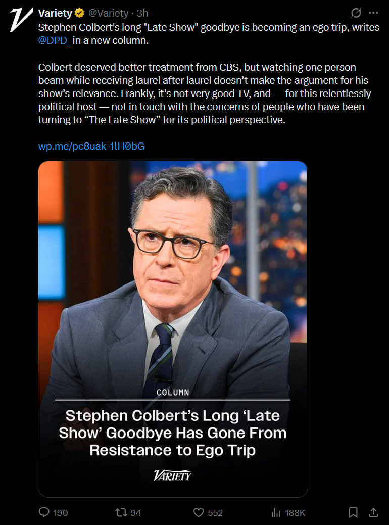 >>530582564>turning to "The Late Show" for its political perspectiveRemember when that show was comedic in nature and a platform for Hollywood stars to promote their movies?