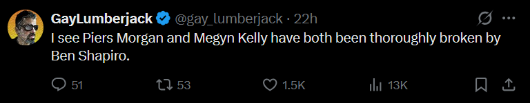 >>53058277260-year-old Piers and 55-year-old Megyn are acting aggrieved that 42-year-old Ben called them antisemites for criticizing Israel. Ben says he hasn't called either of them an antisemite, even less so for criticizing Israel and they are lying grifters and clickwhores to claim so. Now it should be easy for Piers and Megyn to shoot down Ben by providing a clip where he calls them antisemites. But neither has done this. They just go 100x poor little Ben, little emasculated Ben, Ben is so little, poor Ben boohoo I will have a guest on the show tomorrow to say how little Ben is. Just link/provide/cut the fucking antisemite clip but you know that is the one thing that is not going to happen.This eright drama is the worst show on Earth.