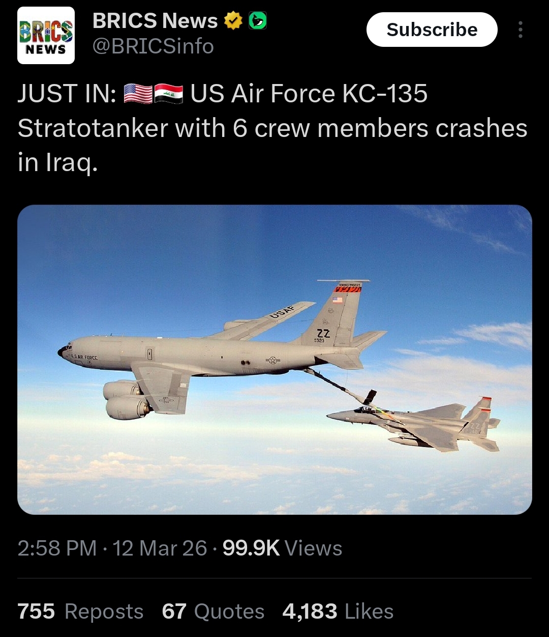 >BREAKING: US refuelling plane goes down over IraqL after L.