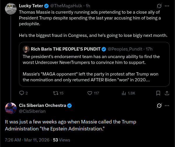 MAGA and good evening, frens!>>530591473Thanks for baking, owlman. Massie just keeps digging the hole deeper for himself.