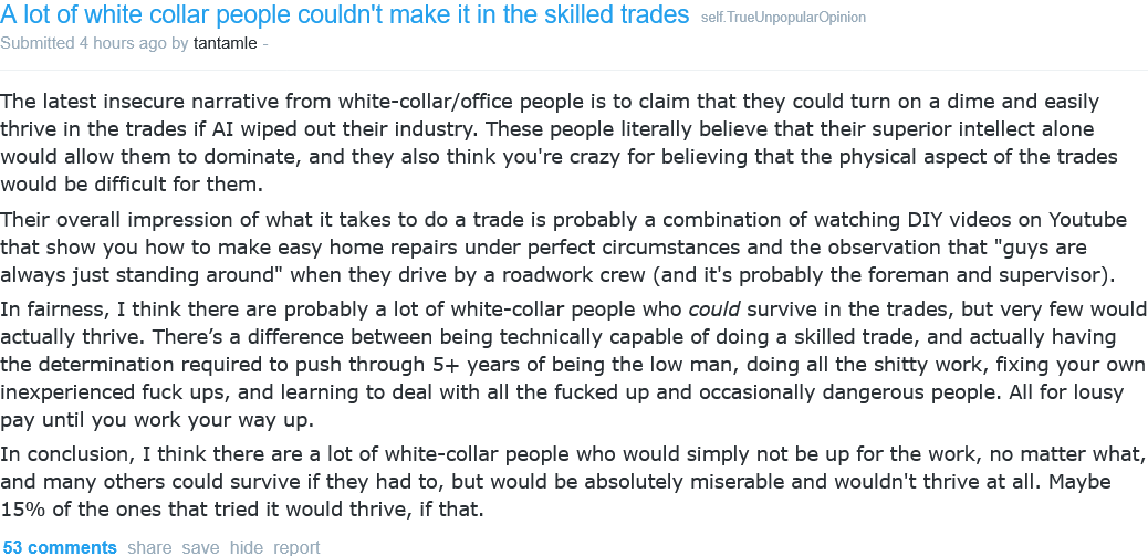 When are you going to quit your woke white-collar job and become a patriot MAGA tradesman?