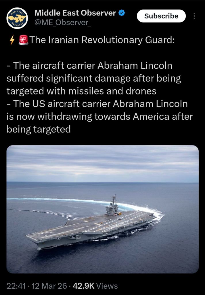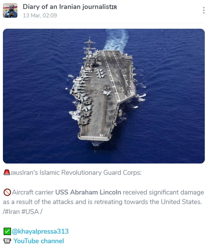 >IRGC claiming severe damage to USS Abraham Lincoln