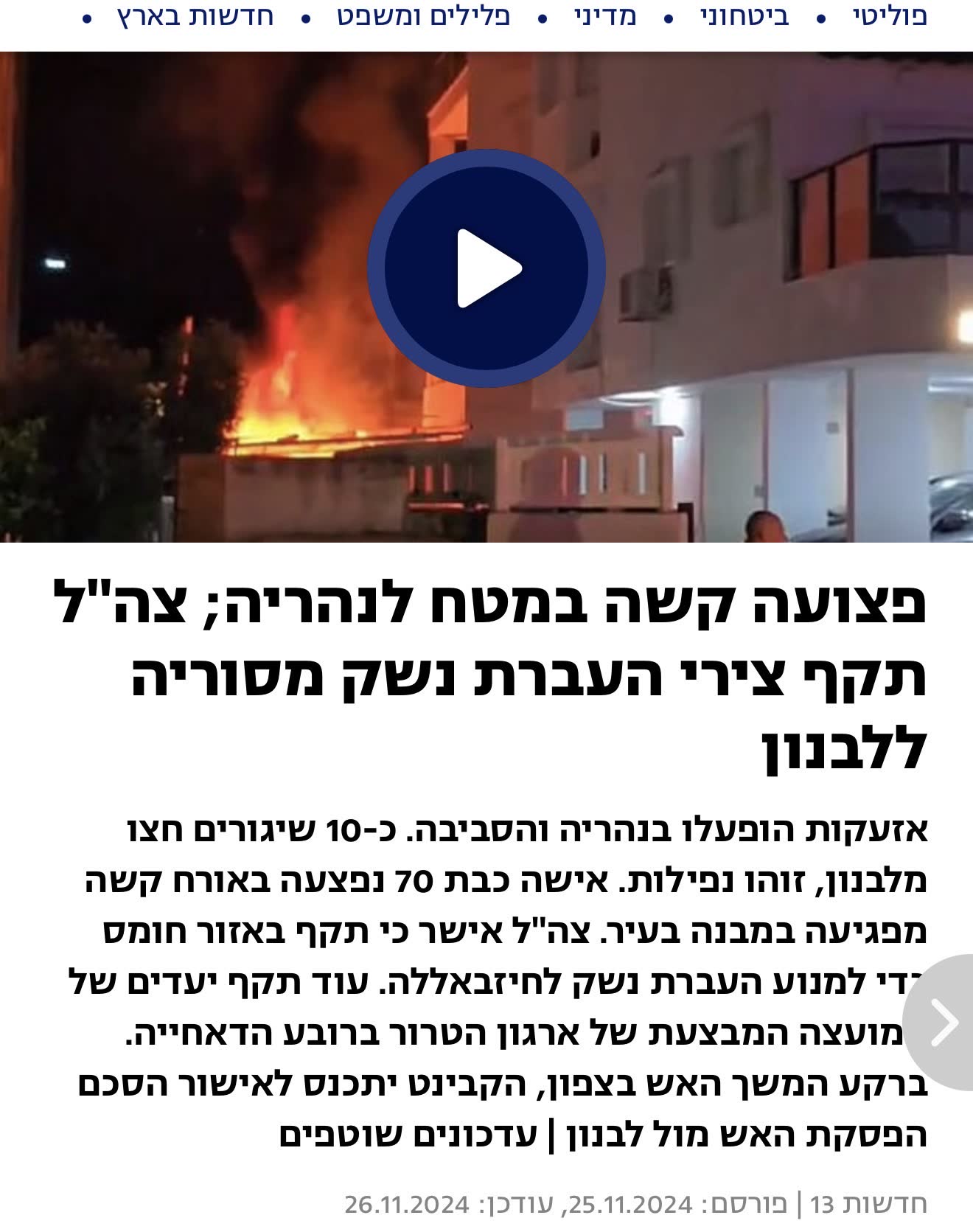 >Hezbollah rocket impacts in a moshav near Netanya — no casualties.