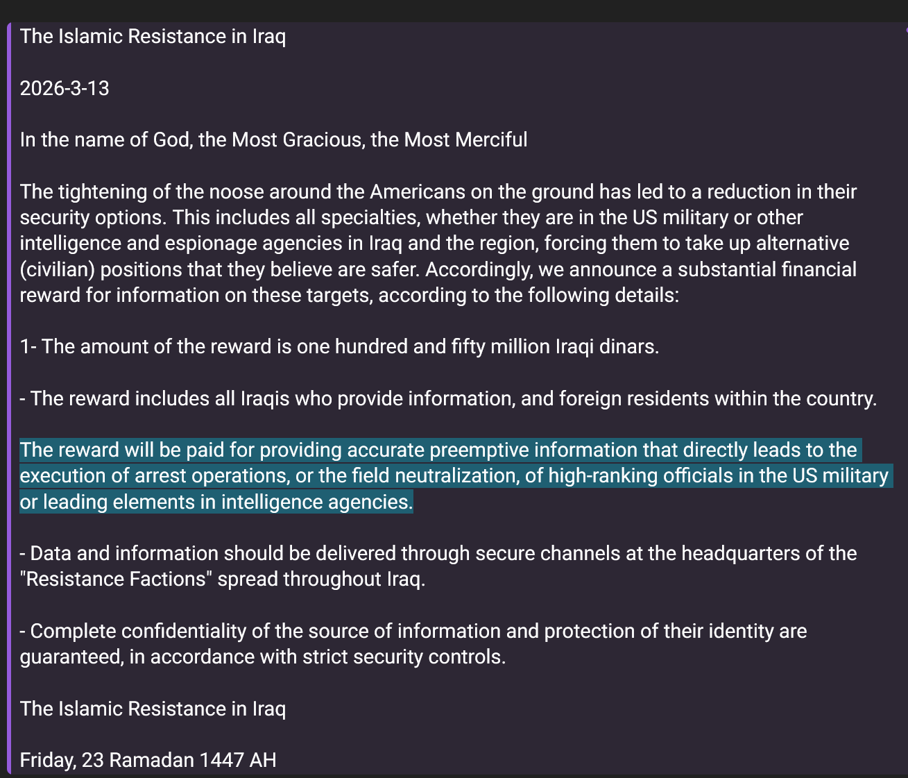 Iraqi militias are now offering a bounty for US military officials kek