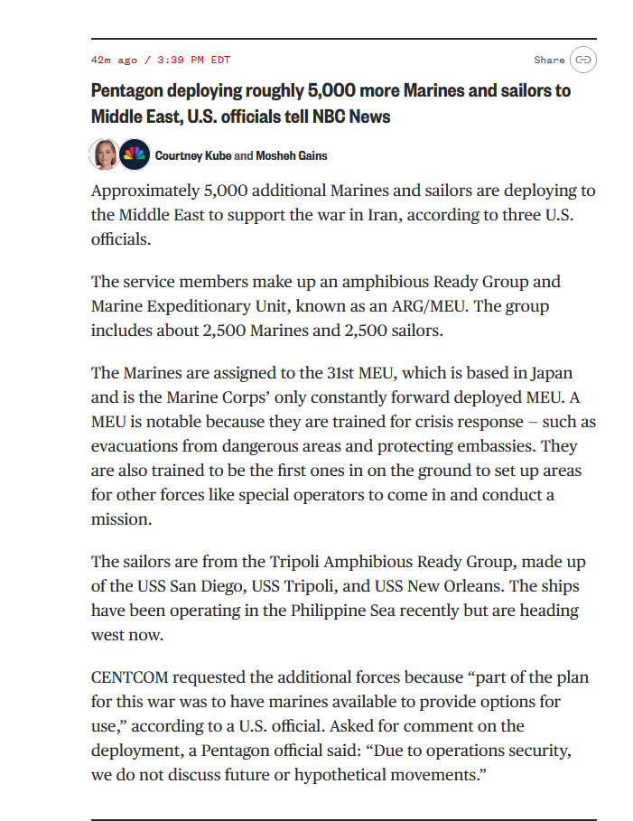 >>530660065>Approximately 5,000 additional Marines and sailors are deploying to the Middle East to support the war in IranAren't some amphibious ships already there? Maybe the two-week trip from Japan is a ruse to make Iranians believe they have time to prepare, while the real landing will happen right now.