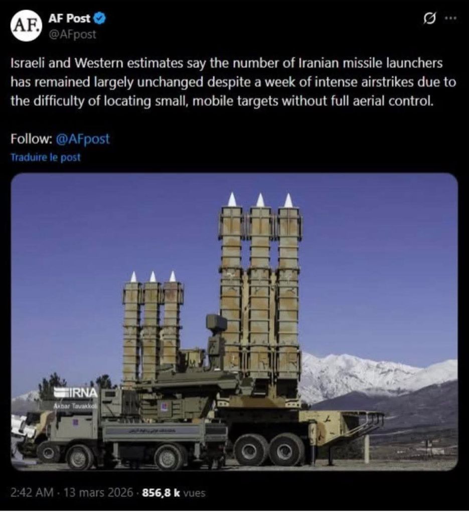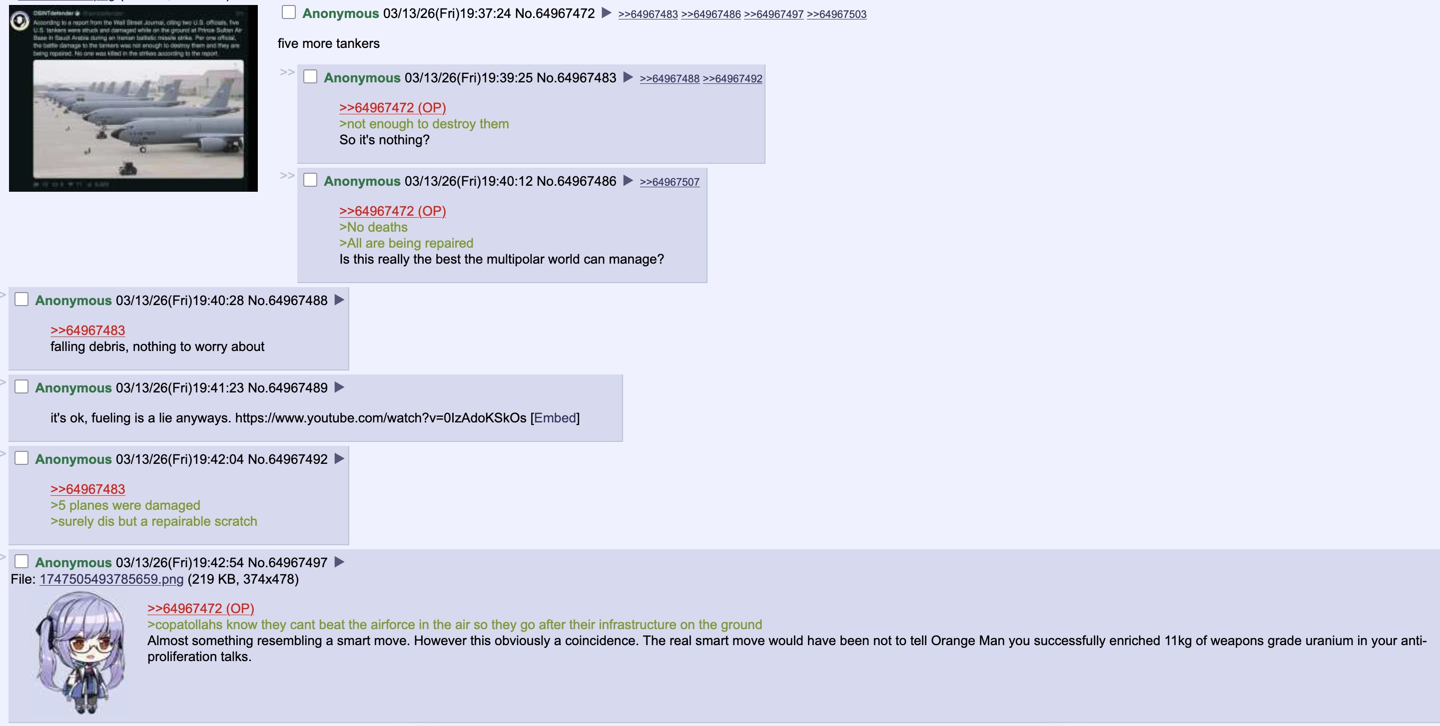 Previous: >>530670336Timeline:▶ Day: 14>Five U.S. Air Force refueling planes were struck and damaged on the ground at Prince Sultan Air Base in Saudi Arabia. - WSJ.>US to deploy a Marine Expeditionary Unit to the middle east.>France and Italy announce intentions to surrender>Hegseth: "The only thing prohibiting transit in the straits right now is Iran shooting at shipping. It is open for transit should Iran not do that." [lol]>Bombing campaign over Teheran continues>Explosion near Ferdowsi Square during Quds Day demonstrations caught on film. Times of Israel claims mass casualties, no other sources corroborate. [hand rubbing intensifies]>The US lost a KC-135 over Iraq, entire crew of 6 killed>One French soldier killed with additional 6 wounded in an attack on a French base in Iraqi Kurdistan>Netanyahu seen for first time since war began, gives speech claiming the attacks launched on February 28 had prevented Iran from moving its nuclear and ballistic projects underground [lmao]▶Oil pricesWTI 98BRENT 103MURBAN 113▶Livestreamhttps://www.youtube.com/watch?v=4E-iFtUM2kk ▶Telegram channels:https://rentry.org/tgnews▶Twitter accountshttps://nitter.net/clashreporthttps://nitter.net/FaytuksNetworkhttps://nitter.net/sentdefender▶Israel Rocket Alertshttps://www.tzevaadom.co.il/en/▶Air Traffichttps://www.flightradar24.com/https://flightaware.com/livehttps://globe.adsbexchange.com▶Maritime Traffichttps://www.marinetraffic.com/https://www.vesselfinder.com/NOTE: Ignore any thread made by meme flags, particularly israel.