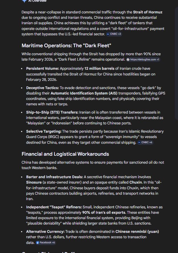 >>530672847That island that just got destroyed is the island that off loaded 90% of Iranian oil >Kharg Island is arguably the most critical piece of energy infrastructure for Iran, functioning as its primary oil export hub and serving as a central "Achilles' heel" in its economic and military strategy>As the central node for roughly 85% to 95% of Iran's crude oil exports, its security is directly linked to the financial survival of the Iranian regime and its capacity to fund military operations, particularly in the ongoing 2026 Middle East conflict>Kharg Island, located in the Persian Gulf, is the terminal for 90% of Iran's crude oil exports, with China being the largest buyer>As the key "Achilles' heel" of Iran’s energy-dependent economy, this terminal pumps millions of barrels daily, primarily to China, making it a major strategic target.China isn't getting shit through the strait.