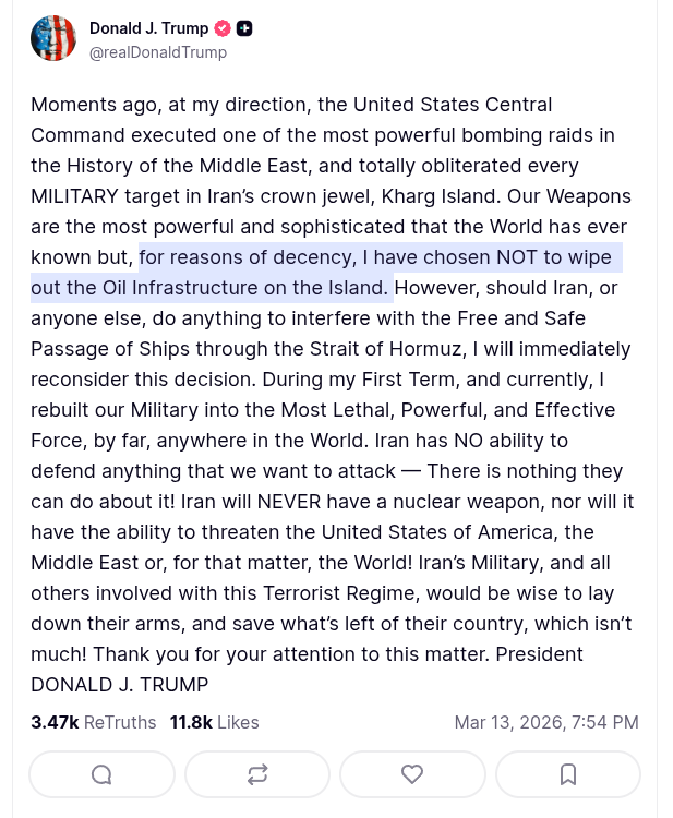 >US Air Force strikes Kharg Island, Iran's main oil hub. Only "military targets" hit