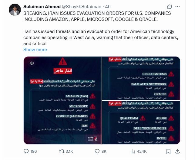>This warning concerns the offices and centers of major technology companies, including Qualcomm, Adobe, Dell Technologies, Intel, Apple, Cisco Systems, Palo Alto Networks, Oracle, Salesforce, Amazon (AWS), Microsoft, and Google (Alphabet), in the cities of: Dubai, Riyadh, Doha, Kuwait, Manama, and Oman.