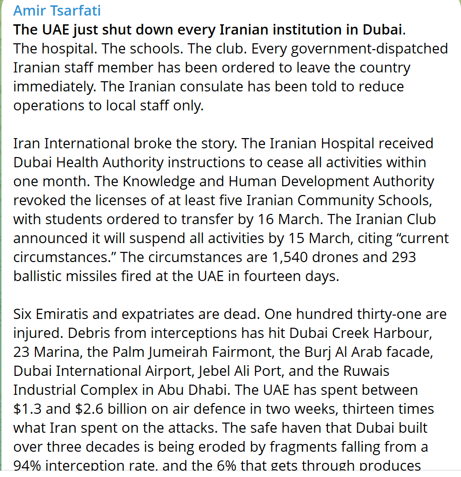 cont'd from pic related ending:The safe haven that Dubai built over three decades is being eroded by fragments falling from a 94% interception rate, and the 6% that gets through produces fires on the evening news every night.The institutional closures are the diplomatic equivalent of what the insurance industry did on 5 March. The P&I clubs severed the financial relationship between Gulf shipping and global commerce. The UAE is now severing the social relationship between Iran and the Gulf’s largest commercial hub. The hospital that treated Iranian expatriates, the schools that educated their children, the club where the community gathered, all closed. Not because of what happened inside them but because of what is happening above them.There are approximately 400,000 to 500,000 Iranians living in the UAE. Many have been there for decades. They run businesses, own property, send their children to the schools that just lost their licenses, and receive care at the hospital that just received its shutdown notice. The closures do not target combatants. They target infrastructure of normalcy. The message is not subtle: if your government fires missiles at our towers, your community loses its hospital.The UAE closed its embassy in Tehran on 1 March, three days after the war began. It has now closed Iran’s institutional presence in Dubai. The diplomatic rupture is complete. No embassy. No consulate staff. No hospital. No schools. No club. Two countries that share a 33-kilometre waterway, $300 billion in Iranian assets on Emirati soil, and a fifty-year dispute over three islands that Iran seized in 1971 have reached the point where the only Iranian presence the UAE will tolerate is the drones it shoots down.