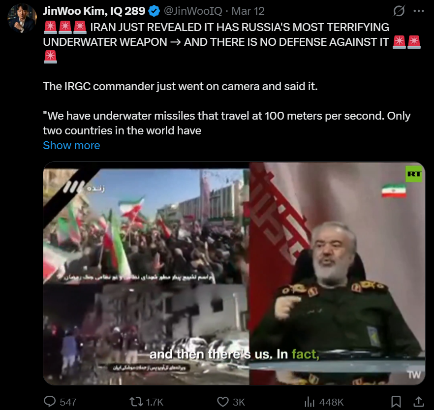 >>530677742THREAD THEMEhttps://www.youtube.com/watch?v=CqGYZ8nsuLALATEST AP VIDEOS>Oil ship attacked near southern port of Basrahttps://www.youtube.com/watch?v=Q_PIb0-uI6U>US Central Command releases video of strikes on Iranian planes, boats, truckshttps://www.youtube.com/watch?v=_s_RB3JbQ2o>US says it destroyed 16 mine-laying Iran vesselshttps://www.youtube.com/watch?v=0iRKXvBM_D8>UAE releases video of air defenses intercepting and destroying droneshttps://www.youtube.com/watch?v=VrWM_pU8zOQ>Several airstrikes hit Iran as Israel confirms a new wave of attackshttps://www.youtube.com/watch?v=cNvXhqZbfVIZEROHEDGE TOP HEADLINEShttps://www.zerohedge.com/geopolitical/us-says-ayatollah-wounded-disfigured-while-other-iranian-leaders-defiantly-marchSIMON WHISTLER - WARFRONTShttps://www.youtube.com/watch?v=miY6bnJoB2cLATEST CASPIAN REPORThttps://www.youtube.com/watch?v=mQfQwLW6CNwSAM HARRIS ON WHY THE WAR WAS NECESSARY*https://www.youtube.com/watch?v=FDXh71Sy1mkMILITARY HISTORIAN EXPLAINS ROOT CAUSEhttps://www.youtube.com/watch?v=GjiIHiltZ4A