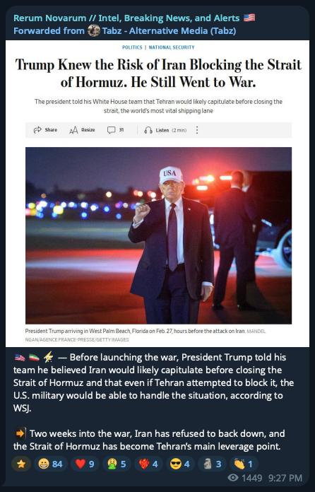 Previous: >>530675351Timeline:▶ Day: 15>BREAKING: Iran may allow oil tankers through the Strait of Hormuz if traded in Chinese currency>US Air Force strikes Kharg Island, Iran's main oil hub. Only "military targets" hit>Five U.S. Air Force refueling planes were struck and damaged on the ground at Prince Sultan Air Base in Saudi Arabia. - WSJ.>US to deploy a Marine Expeditionary Unit to the middle east.>France and Italy announce intentions to surrender>Hegseth: "The only thing prohibiting transit in the straits right now is Iran shooting at shipping. It is open for transit should Iran not do that." [lol]>Bombing campaign over Teheran continues>Explosion near Ferdowsi Square during Quds Day demonstrations caught on film. Times of Israel claims mass casualties, no other sources corroborate. [hand rubbing intensifies]>The US lost a KC-135 over Iraq, entire crew of 6 killed>One French soldier killed with additional 6 wounded in an attack on a French base in Iraqi Kurdistan▶Oil pricesWTI 98BRENT 103MURBAN 113▶Livestreamhttps://www.youtube.com/watch?v=4E-iFtUM2kk ▶Telegram channels:https://rentry.org/tgnews▶Twitter accountshttps://nitter.net/clashreporthttps://nitter.net/FaytuksNetworkhttps://nitter.net/sentdefender▶Israel Rocket Alertshttps://www.tzevaadom.co.il/en/▶Air Traffichttps://www.flightradar24.com/https://flightaware.com/livehttps://globe.adsbexchange.com▶Maritime Traffichttps://www.marinetraffic.com/https://www.vesselfinder.com/NOTE: something something neutrality, just don't be a nigger and split thread or shit up the OP, or complain about the baker.