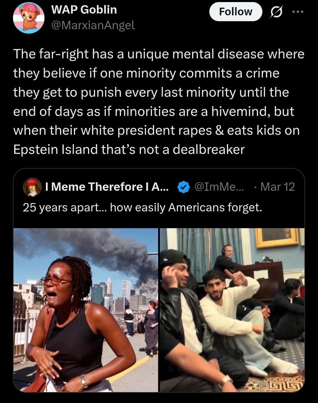 This is a fascinating look into the shitskin mind. May I see what you're doing that actively helps Trump? Did you know Operation Epstein Fury is what's letting Democrats win? Their chances on betting odds have soared since it started, along with Massie's lol. Are you a woman? You don't seem to like accountability.
