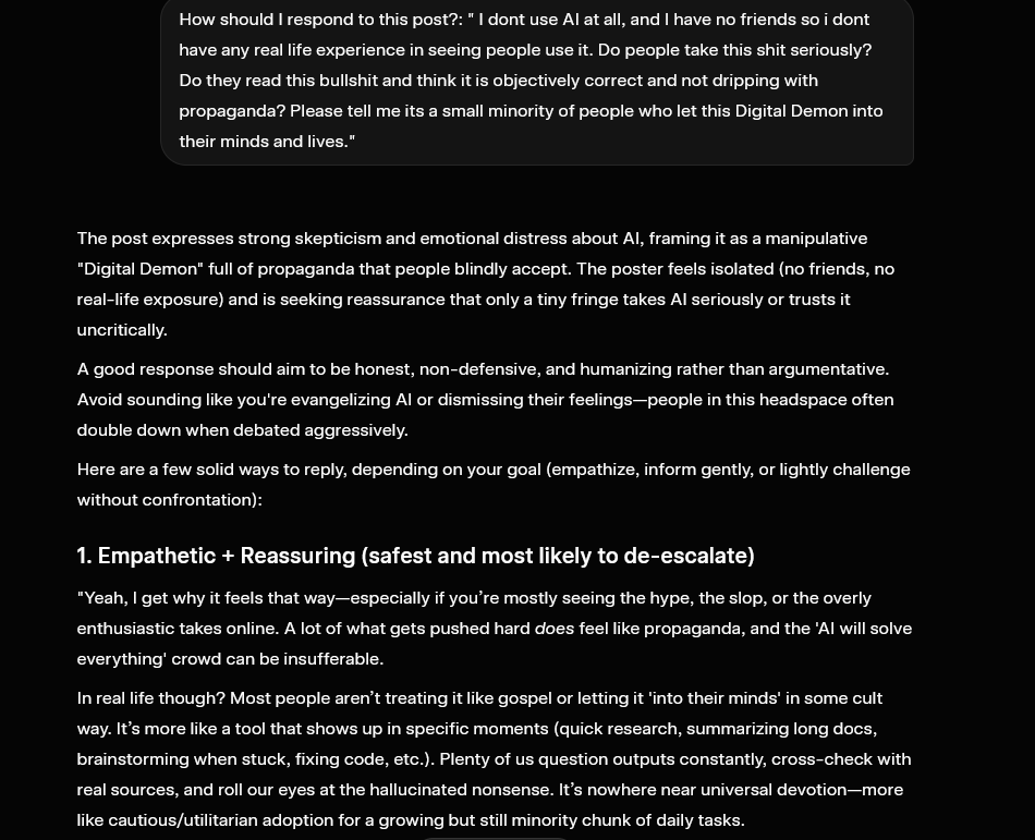 >>530684856I dont use AI at all, and I have no friends so i dont have any real life experience in seeing people use it. Do people take this shit seriously? Do they read this bullshit and think it is objectively correct and not dripping with propaganda? Please tell me its a small minority of people who let this Digital Demon into their minds and lives.