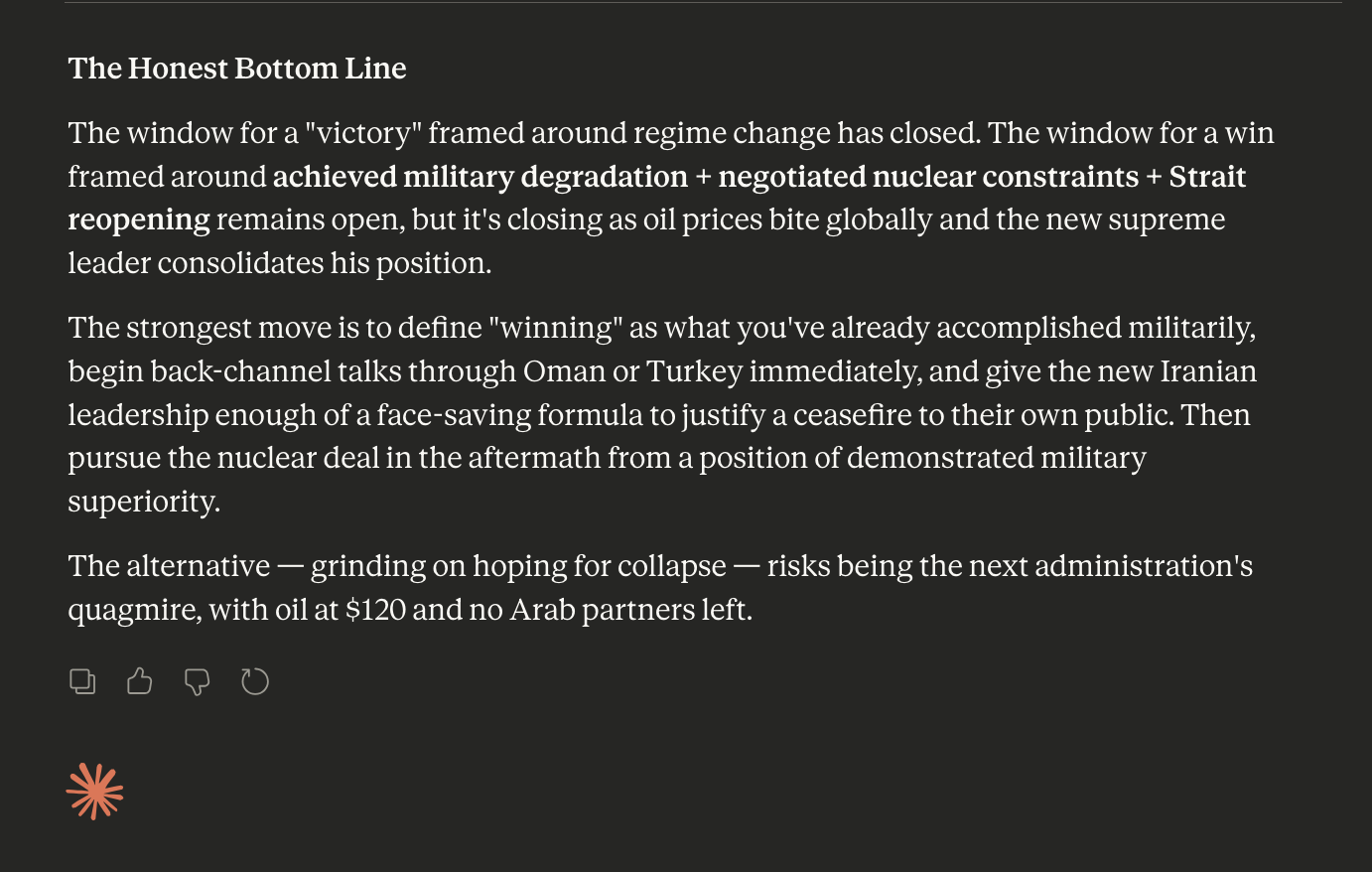 So very concretely the outcome of the war so far is that Iran controls the world's most critical energy chokepoint, and Russia can now sell their own oil freely and at a premium.I can't think of another U.S. war that's been such an obvious strategic disaster so quickly: normally it takes them a couple of yearsEven the jew shills here have gotten far less cocky as of late. I think they realize this epic fail as well.