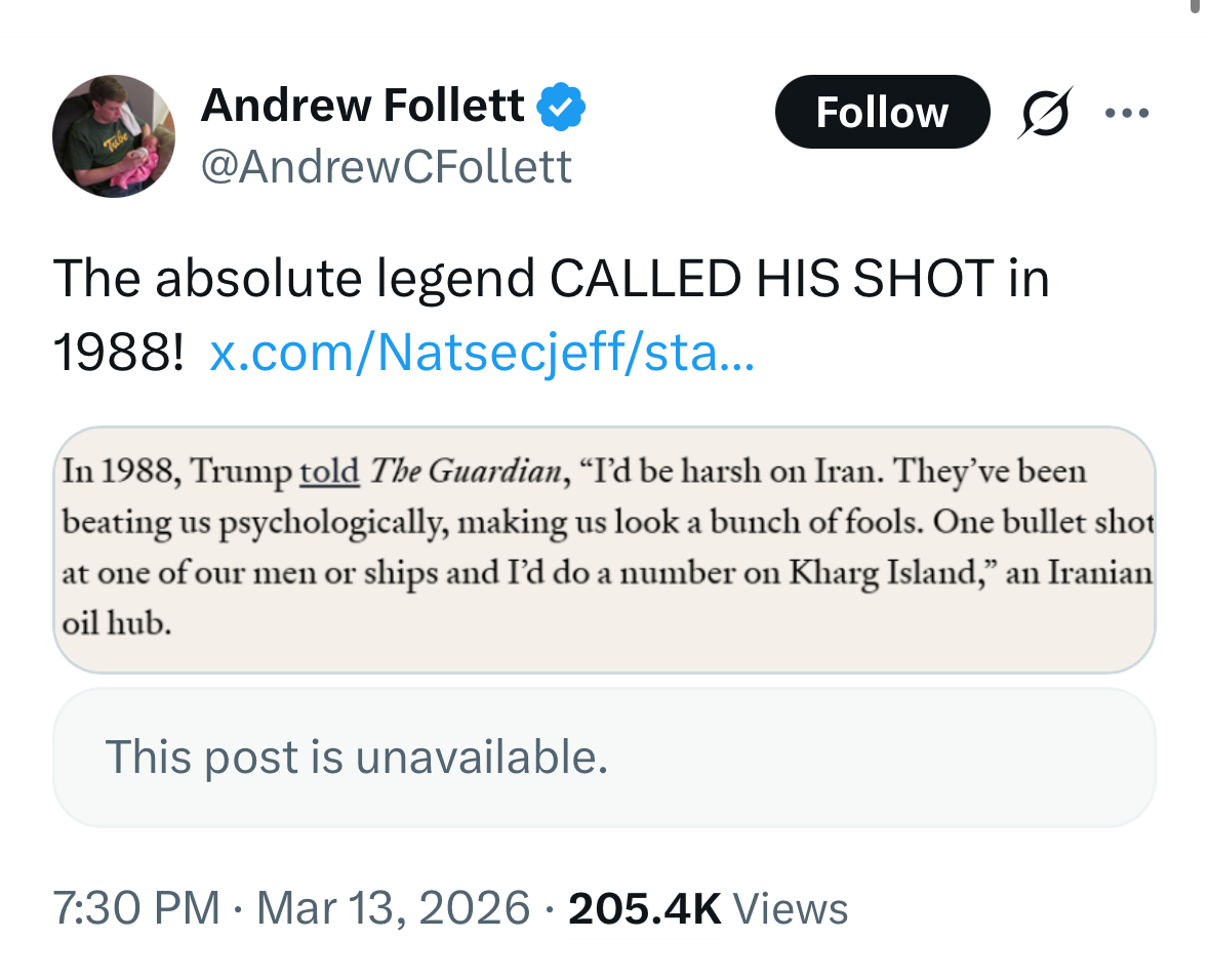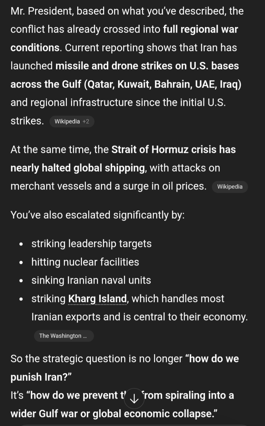 By the by, as someone who has closely followed Trump's moves for over a decade now I can tell you that the Marines headed to the Strait of Hormuz are a distraction. The objective is the same (seizing Kharg Island) but it will be Airborne (probably but not guaranteed to be the 173rd AB out of Italy) and it will be soon. Next couple of days or so.Trump likes to play the game of deception. He has the Iranians thinking they're safe for a week or two while the USS Tripoli group steams its way into the region but he's going to send in Airborne well before that to catch them off guard.Screenshot this so I can be called a genius when it happens.