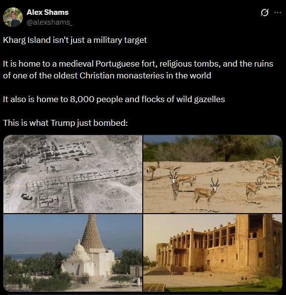 >Iran’s report re: US attacks in Kharg Island>According to Fars field reports, 2-3h ago, Kharg Island was subject to US attacks with more than 15 explosions on the island.>During these attacks, the US attempted to damage the Army’s air defense systems, the Joshan Naval Base, the airport control tower, and the Iranian Offshore Oil Company (IOOC) helicopter hangar.>Fars’ Field observations indicate thick smoke rising from various parts of the island, but none of the oil infrastructure was damaged in these attacks. >Iran had previously warned of the consequences of attacking the country’s energy infrastructure, stating that should such an event occur, all oil and gas infrastructure in the region in which the US and its allies have an interest would be set ablaze and destroyed.>Following these attacks, Trump claimed that the US had successfully targeted all military objectives on Kharg Island & "complete destroyed" the island's air defense systems. >However, 1h after the attack, there was air defense activity on the island which straight up debunks their claims that they destroyed all air defenses here.>Trump has also repeatedly claimed the complete destruction of Iran’s missile capabilities, yet the wave of missile and drone attacks [from Iran] has now reached its 48th round.