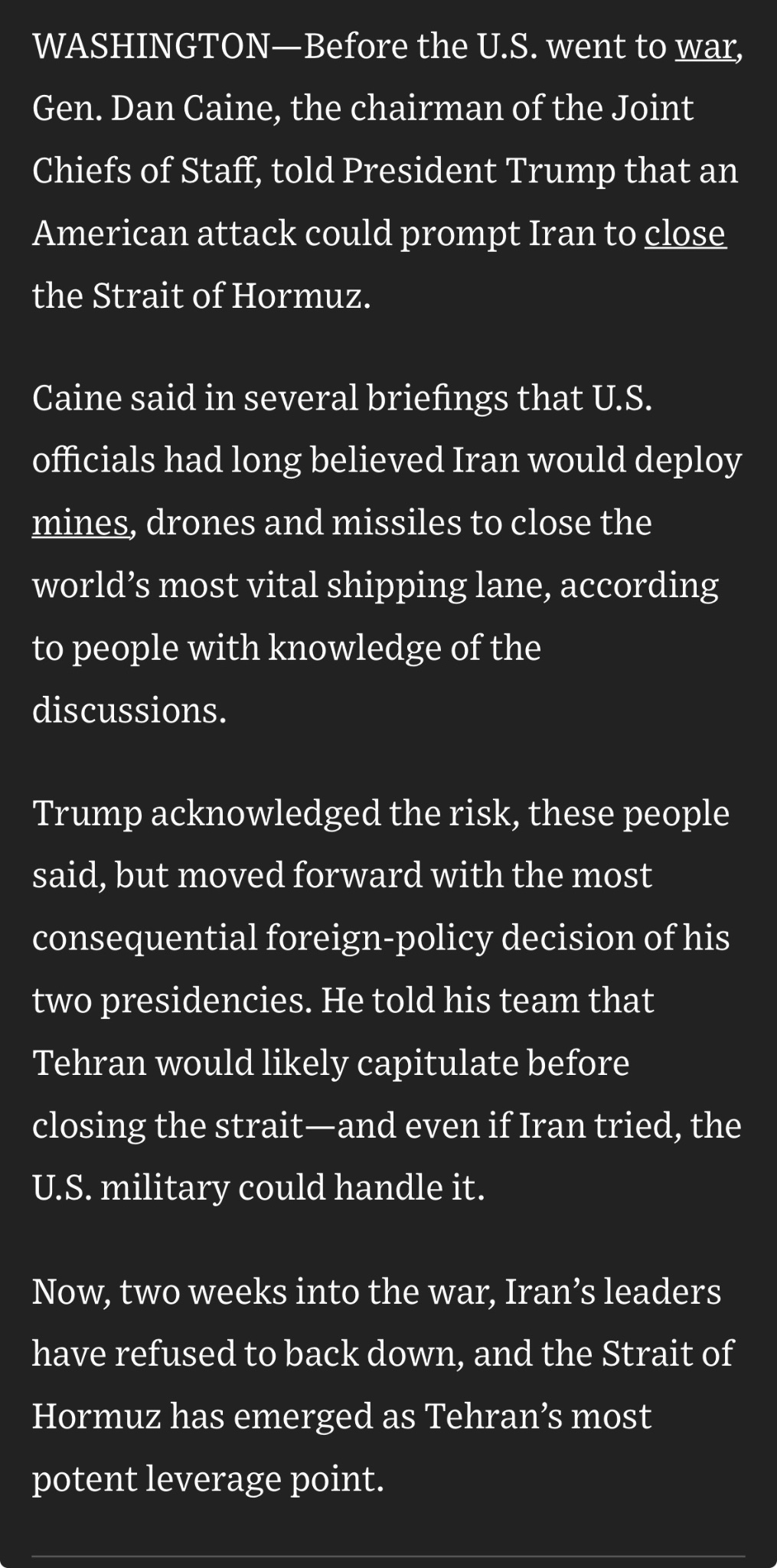 Trump informed his team in the White House before the war that he believed Iran would likely surrender before closing the Strait of Hormuz, and even if Iran attempted to do so, the US military would be able to deal with it — WSJ
