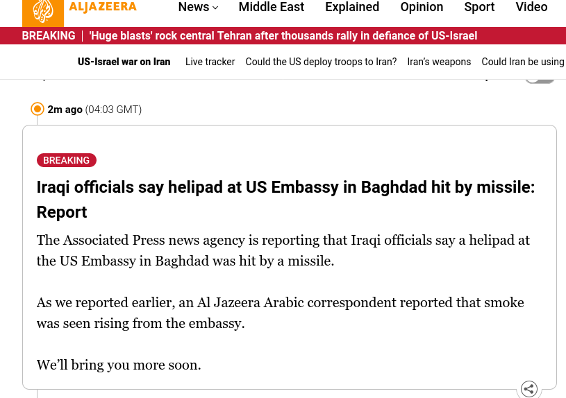 >NEW VIDEOVisual confirmation of a destroyed radar system on top of the U.S. Embassy in Baghdad after a direct drone strike.