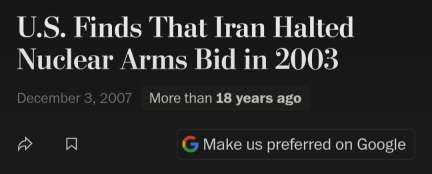 >>530690939Yes my israeli friend.https://www.washingtonpost.com/archive/national/2007/12/04/us-finds-that-iran-halted-nuclear-arms-bid-in-2003/946fbf67-c9ba-4ce7-a097-04557b85f39a/