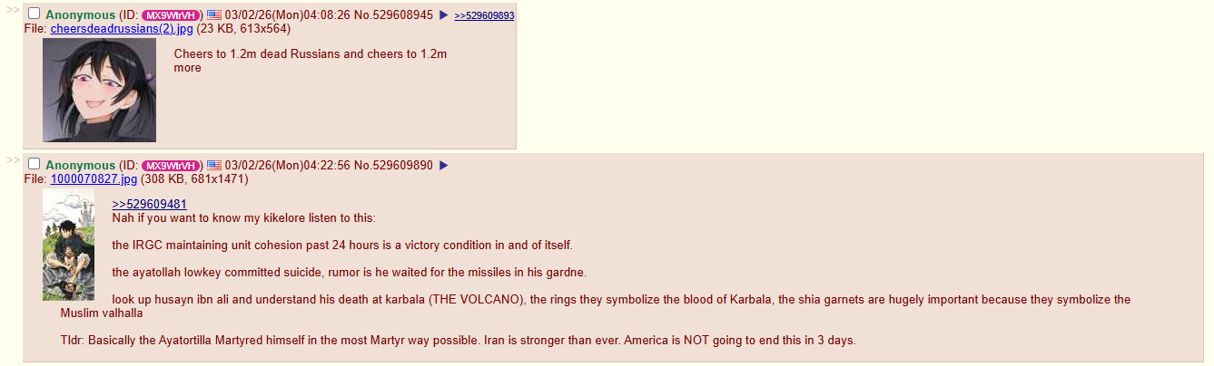 Previous:>>530672514Timeline /tug/: https://files.catbox.moe/m97wmq.pdf▶WARNINGBe aware, any /chug/ thread that uses globohomo nuspeak wording in the OP (such as Kyiv) or cites UKROP sources (like video game footage) are fake shill threads.>By posting in these threads, you recognize Israel controls the NATO Council and you irrevocably denounce the Talmud out of your own volition▶Latest>As the USA and Israel fail to weaken Iran, desperate measures ease sanctions on the purchase and sale of Russian Oil; Western Europe and the Ukraine are seetheing - https://archive.today/MtsJu>Russian Stormtroopers liberate Chervonaya Zarya in Sumy - https://archive.today/gSSWt>GOIDA! Hero of The Ukraine, Commander of the 39th Tactical Aviation, Colonel Oklesandr Dovhach liquidated - https://archive.today/MQMlI>Battlegroup South Stormtroopers liberate Golubovka in Donetsk - https://archive.today/XOQ91>The Ukraine and Russia complete 500 for 500 POWs exchange - https://archive.today/La2Is>Russian stormtroopers liberate Sosnovoye in Donetsk - https://archive.today/wvUKG>(BONUS!!!) Russian GRU providing Iran intelligence to strike American and Israeli military personal and infrastructure - https://archive.today/AO2A5>Russian stormtroopers liberate Yarovaya in Donetsk - https://archive.today/ms2Ja>Russia ready to withdrawal oil industry from European Union instead of wasting time on awaiting a blanket ban - https://archive.today/awakn▶/chug/https://rentry.org/chug2024▶Video Archivehttps://rentry.org/chugvidz▶Z Radiohttps://rz-life.ru/