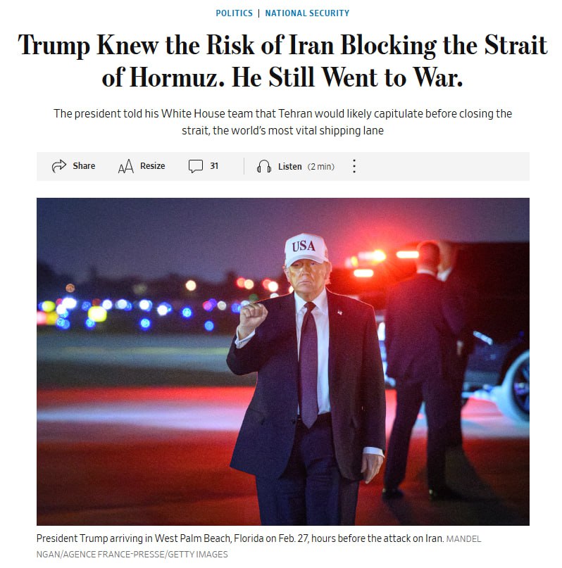 >Before launching the war, President Trump told his team he believed Iran would likely capitulate before closing the Strait of Hormuz and that even if Tehran attempted to block it, the U.S. military would be able to handle the situation, according to WSJ.>Two weeks into the war, Iran has refused to back down, and the Strait of Hormuz has become Tehran’s main leverage point.