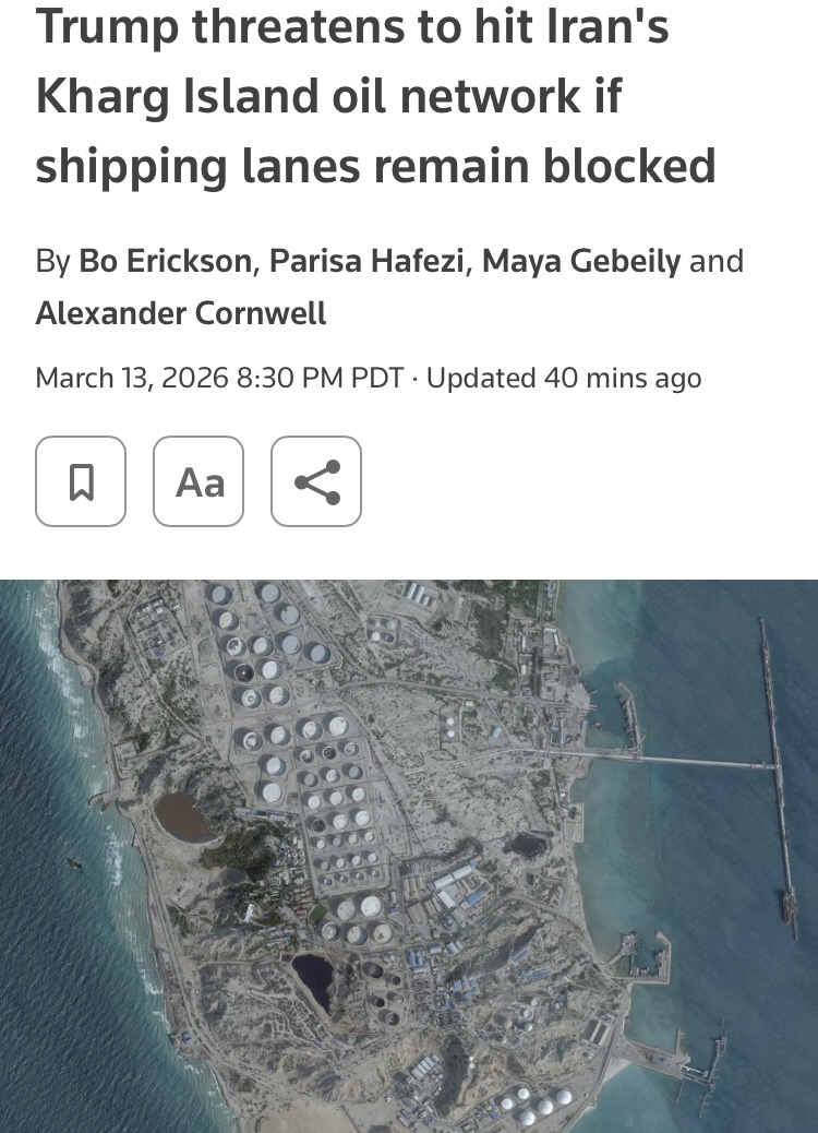 >>530696096Roll over who? They’re panic panicans now in the US as Trump likes to say. Iran is controlling the pace and tempo of this war. They know they will soon cripple the US economy and markets. If they blow up the Island. So what. There goes all the storage tanker in Saudi and other places they haven’t hit yet. Bang. No oil for 2 years until it’s all rebuilt. Then the pipelines. And on and on. Iran can shut down the whole Middle East for years. They’ve planned this a long time ago And the US walked in like typical arrogant and ignorant American fools and stepped in the trap. Beguiled by Israeli promises and false intel. Well there you go. You now have an Iraq x 10. And you couldn’t even beat Iraq. Oh and by the way. If you want boots on the ground?You’re going to have to reinvade Iraq first! All over again! Hahahaha. That’s the scale of your fuckup.