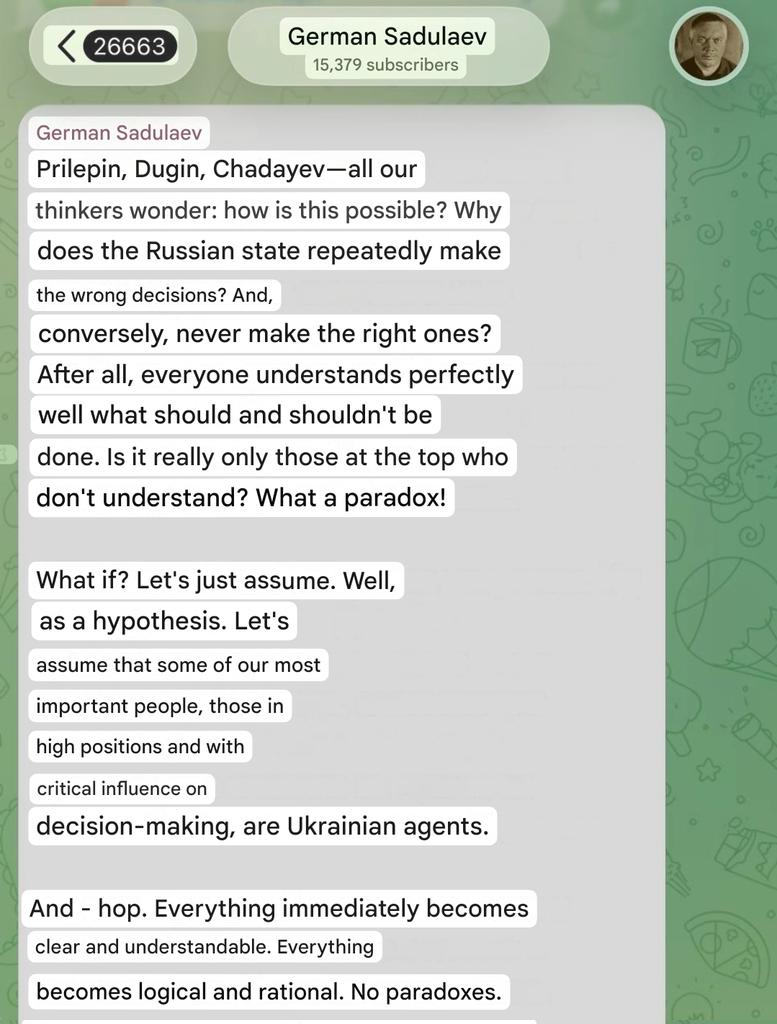 >The speed at which the Putin regime is destroying Russia has coalesced into conspiracy in the minds of Russia's popular military bloggers, now with accusations that Russian leadership is comprised fully of Ukrainian agents.KHAKHLIIIIIIIII